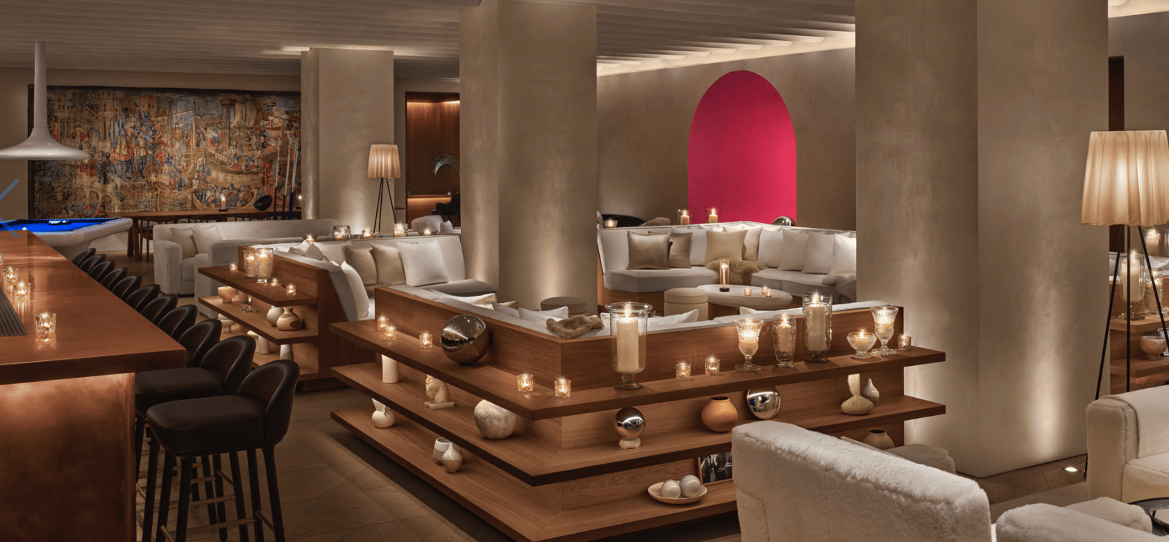 A polished social hub where design leads the conversation. Intimate seating, sculptural details, warm lighting, and quiet drama create a gathering space that feels modern, inviting, and unmistakably Madrid. Oh yeah, and there is a bar putting out irresistible cocktails.