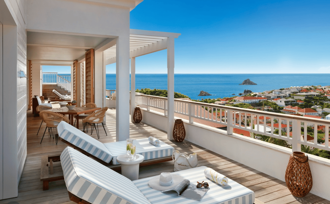 The hotel’s 22 bungalows, suites, and villas sport ocean & garden views, layered with rattan, bold textiles, and sun-washed woods. Private terraces, ocean views, and that effortless French-Caribbean charm that makes staying in feel tempting.
